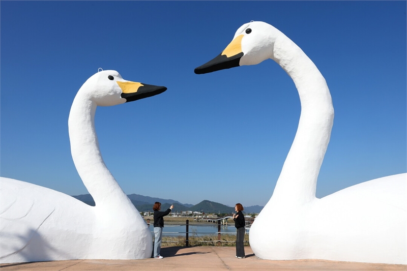 '강진만 춤추는 갈대축제'를 방문한 관광객이 큰 고니 조형물에서 추억의 기념촬영을 하고 있다. [강진군 제공]
