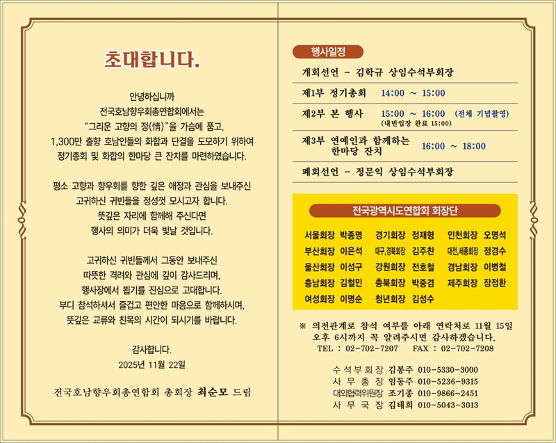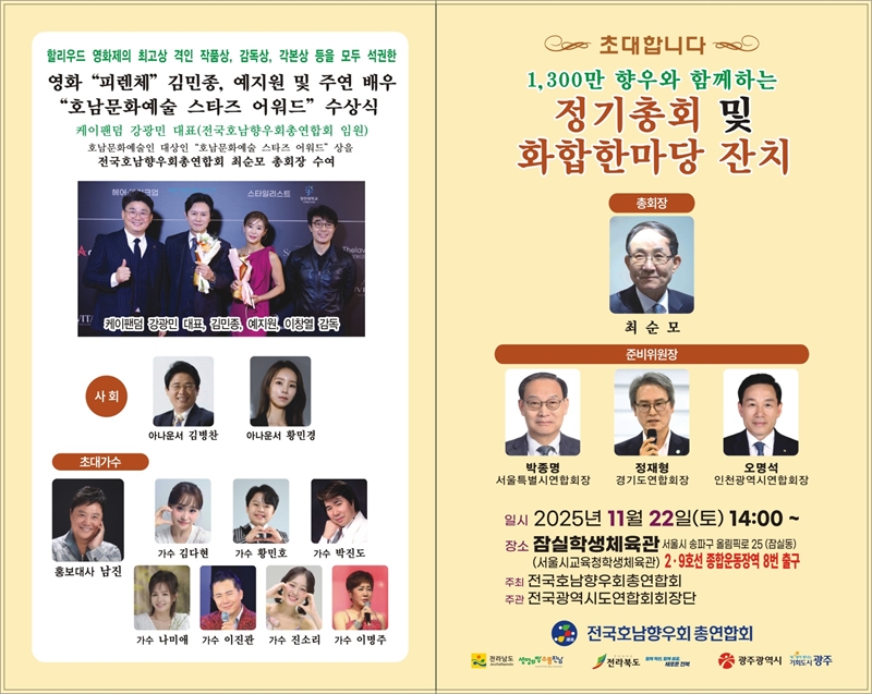한편, 오는 11월 22일(토) 오후 2시 잠실학생체육관에서 열리는 전국호남향우회총연합회 정기총회 및 화합한마당 잔치는 ‘하나된 호남, 더 큰 미래로!’를 주제로 전국 1,300만 향우가 함께하는 대규모 행사로, 지역 간 교류와 통합을 다지는 뜻깊은 자리가 될 예정이다.
