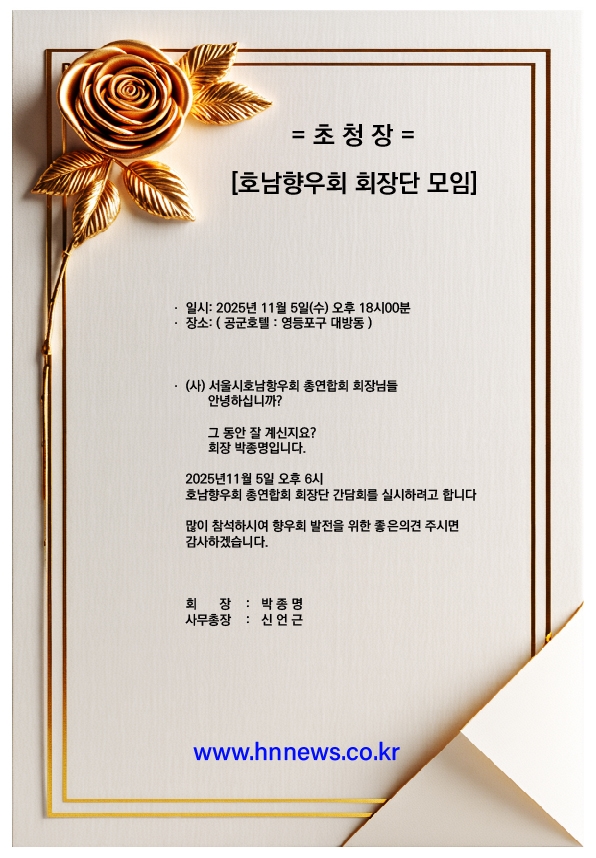 서울 호남향우회 회장단 모임 안내 호남향우회뉴스 승인 2025.10.31 13:37 0 호남햐우회 0 0 호남향우회뉴스 호남향우회뉴스 ssawlove@naver.com 호남향우회뉴스의 기사 더보기 저작권자 ⓒ 호남향우회뉴스, 무단 전재 및 재배포 금지